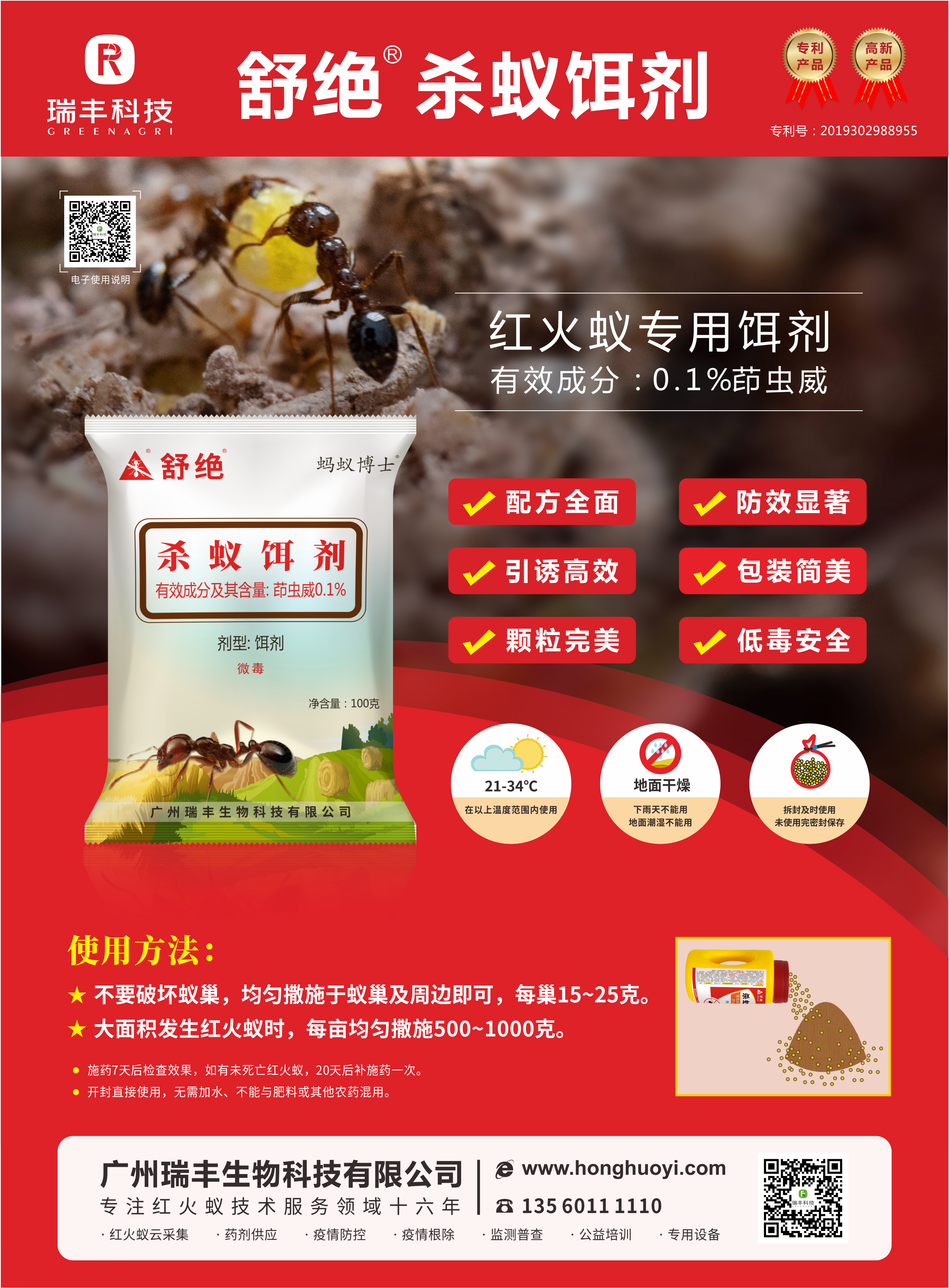 施药是科学防控红火蚁其中的一个关键环节,施药效率影响防控进度,施药效果影响整体防控效果。舒绝杀蚁饵剂(0.1%茚虫威)是一款灭杀红火蚁饵剂,因其能将红火蚁“窝窝端”而受到客户一致认可和好评,被广泛应用于红火蚁各个发生地区的红火蚁防控。当防控大面积红火蚁时,你们是怎么施撒舒绝饵剂的呢?为提高舒绝饵剂施撒效率,我们根据舒绝杀蚁饵剂颗粒大小、颗粒重量特别设计的药剂电动撒播器,特别适用于大面积的饵剂撒施作业。除了能解决以上问题,还有更多令人称赞的产品细节。