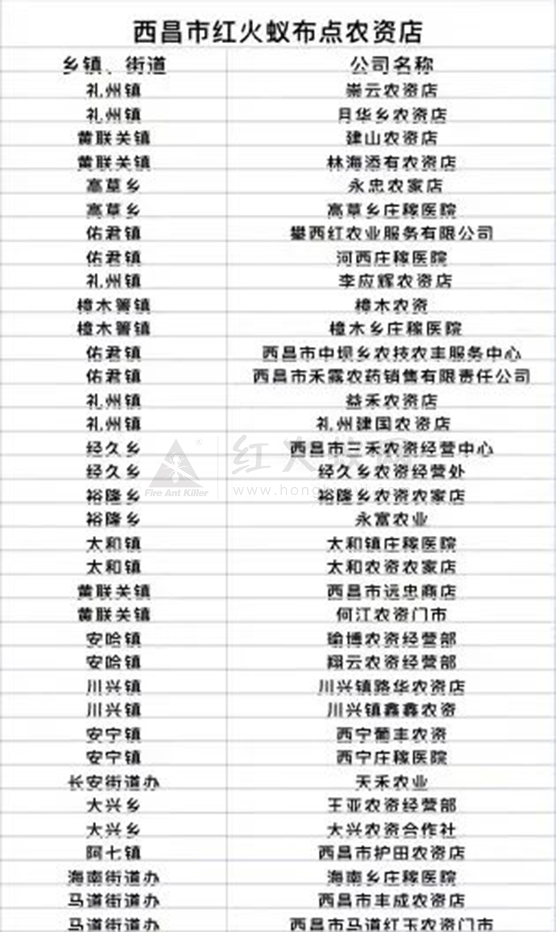 为方便市民群众购买红火蚁防控药剂,目前,西昌市农业农村局在全市各乡镇、街道办布设了36个红火蚁药剂零售网点,逐步构建基层红火蚁自防体系。市民群众可以在以下红火蚁药剂定点销售门店购买红火蚁防治药剂。