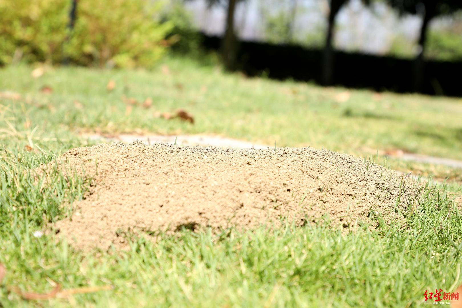 拉着水管在地边走,突然感觉手被什么东西咬了,仔细一看,竟然是红火蚁。”罗吉明讲述,他赶紧绕开蚂蚁窝,拍打掉身上的红火蚁,“被咬处火燎火燎地疼,后来用土办法,找来烟油涂抹,消炎止疼。”被咬后,罗吉明用水灌涌了蚁巢。在芒果地里,罗吉明带着红星新闻记者找到蚁窝,撬开地表的散土,但未看到红火蚁,“地下通道”纵横交错却十分明显。“被咬后,我用水冲淋,估计蚂蚁都躲到地下深处了。”在阿署达村,许多村民在田地都被红火蚁咬过。“去年,有两个村民被咬伤,紧急送到医院抢救,医生说再晚点入院,生命能否保住都不一定。”罗吉明说。“我今年被咬了两次,每次被咬后都去打了针,以防万一。”村民王福仙也是在种芒果的时候不小心被咬。易遇到已入侵到公园绿地“一不注意,踩到蚁窝就可能被咬”在攀枝花市德铭菩提苑附近的公园绿地,保洁员赵启云小心地打扫着地上的落叶。“一不注意,踩到蚁窝就可能被咬。”赵启云说,去年他的右脚背被红火蚁叮咬,留下一块铜钱大小的暗黑色的斑块,一个星期前再次被咬伤,目前伤口都还未愈合。“有些蚁窝还不大,隐藏在草坪里,稍不注意踩上去,很快就会被红火蚁袭击。”红星新闻记者在绿地范围内随机寻找,仅十余分钟,就找到大小不一的红火蚁蚁巢16个。当用木棍翻开一个蚁巢时,成千上万的红火蚁瞬间显露,四处爬散,巢里还有许多白色的蚁卵。