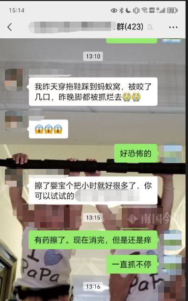曾女士说,事后,她将儿子被红火蚁蜇伤的情况发到了业主微信群,有业主表示自己在小区里也被红火蚁蜇伤过。被蜇伤后,也出现了荨麻疹、红肿等过敏性反应,经过擦药处理后便消肿好了。