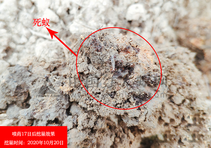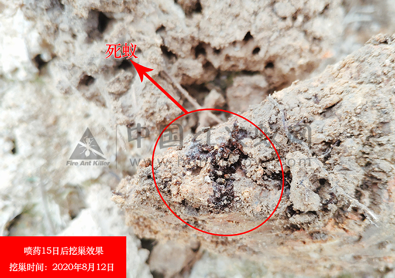 使用喷粉机喷药后,10-15天后进行挖巢检查防控效果,检查巢内是否有红火蚁活蚁。明显可见蚁巢内都是成团死蚁,无红火蚁活蚁,则表示药效优良,喷粉机应用效果好。
