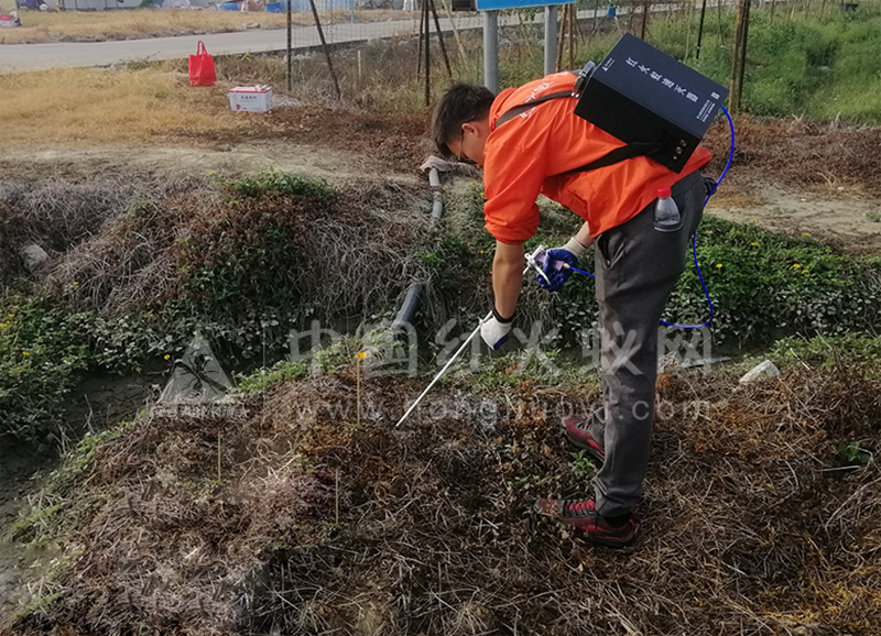 3、喷药按下电源开关,将喷粉管插入蚁巢内部,迅速按压手柄,药粉即由喷枪喷出,药粉随气压通过蚁道被输送到蚁巢,杀灭红火蚁。