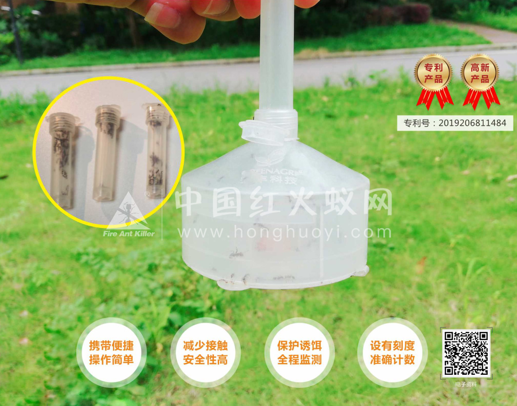 采集器采用扣压式设计,按住上盖能紧密的扣压住底座,可远距离控制进虫口,无需与红火蚁接触,就可将取食诱饵的红火蚁锁在采集器里面,大大的降低了被红火蚁叮咬的风险。