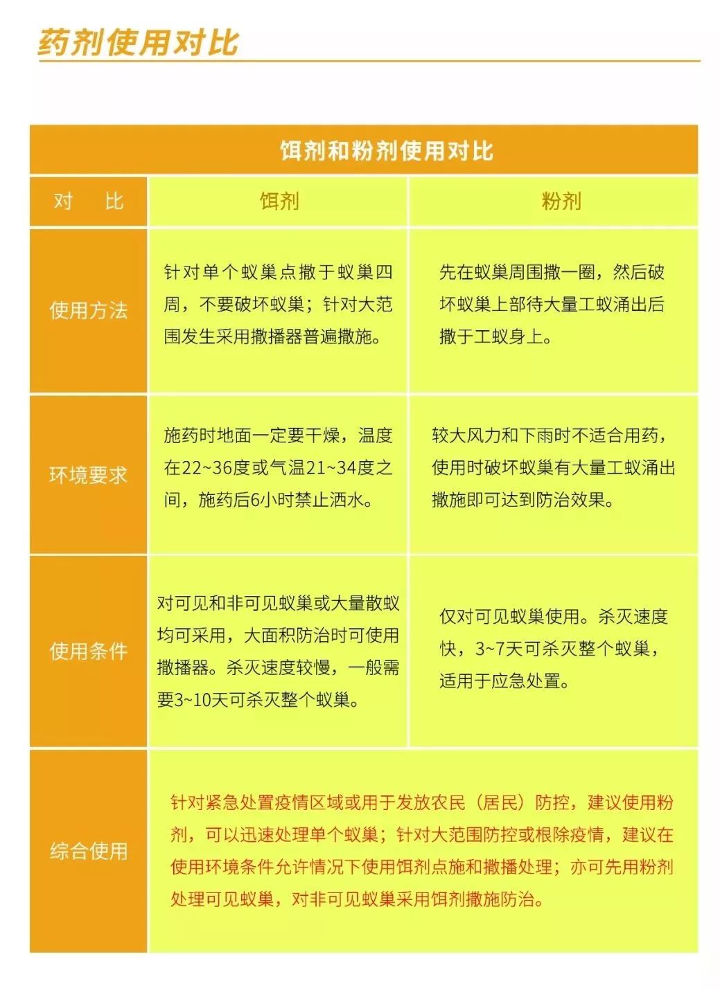 从图表中可以看出,不管是饵剂还是粉剂,都是有效防控红火蚁的优质药剂,至于选择饵剂还是粉剂,应当根据红火蚁的发生程度、分布情况、蚁巢情况、气候因素、地理环境、危害程度等因素综合决定的。