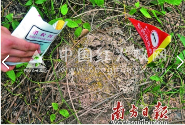 然而,由于红火蚁巢通常深达0.5—1米,结构错综复杂,灌巢法杀灭红火蚁往往需要大量的药物,易造成资源浪费。如果灌巢过度,药液渗入河湖鱼塘及地下水,还会对水环境造成危害,易造成鱼虾死亡。