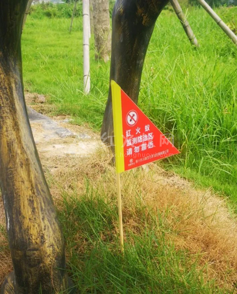 农田附近的道路上,时常会出现一个个小小的沙包,这往往就是红火蚁的栖息地。在惠城区横沥镇洋圳村,身穿红马甲的防治人员一边进行施撒诱饵,一边插上“红火蚁监测防治区”的红色或蓝色旗子。经过今年春季的防控实施,红火蚁疫情蔓延态势有效抑制。洋圳村村民潘福祥:“到处都是、很多地方都是,影响很大,被咬到不是腿上就是手上,哪里都咬,红点、发脓。现在基本上都没有了、很少了,现在不怕红火蚁咬腿、咬手,效果很好。”