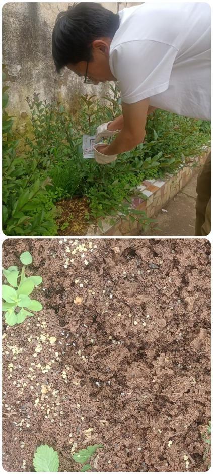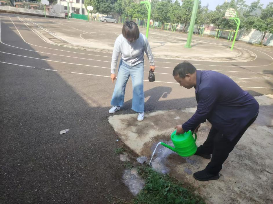 龙池村委会与学校工作人员对龙池小学操场周边发现的5处红火蚁巢穴进行集中消杀