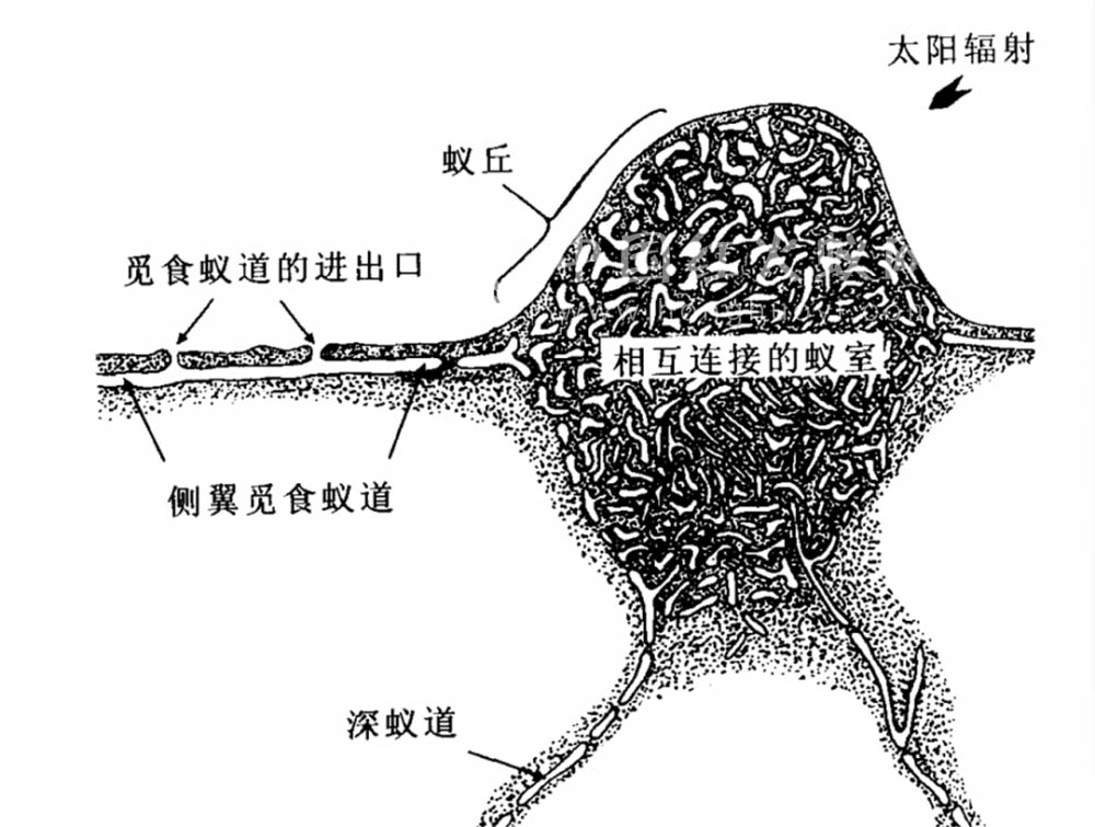 寻找食物时,觅食蚁会通过地表下的蚁道向周围出发,大型蚁穴的觅食蚁道可以延伸到几十米远。
