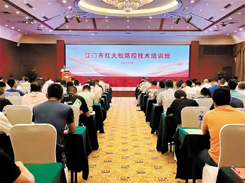 为切实抓好我市红火蚁今秋明春防控工作,最大限度地减轻红火蚁危害,有效控制红火蚁发生和扩散蔓延,保障我市农业生产、公共设施、生态环境安全和人民群众身体健康,我市成立市农作物重大病虫疫情防控指挥部,市农业农村局也在9月底组织举办“2021年江门市红火蚁防控技术培训班”,多措并举,确保公共区域疫情基本控制在一级轻发生水平。