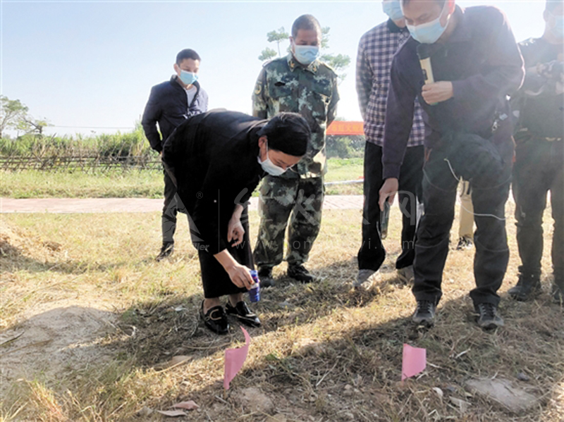 “剿灭红火蚁有两种方法,第一种是把药物围着巢穴周边施放,形成一个包围圈,这种方法需要的时间较长,但相对简单;第二种是先在巢穴周边施放药物,再在巢穴表面红火蚁的活动区域施放药物,用一根小棍子插进巢穴,让红火蚁跑出来,达到扩散药效的目的。”12月1日,在恩平市东成镇庙左村,植保工作人员谢壮锋现场演示如何施药“捣毁”一个红火蚁巢穴。当天,恩平市红火蚁防控工作推进会在这里举行,与会的村级防控服务队队员在植保工作人员的指导下学习,体验了一次“剿灭”红火蚁行动。