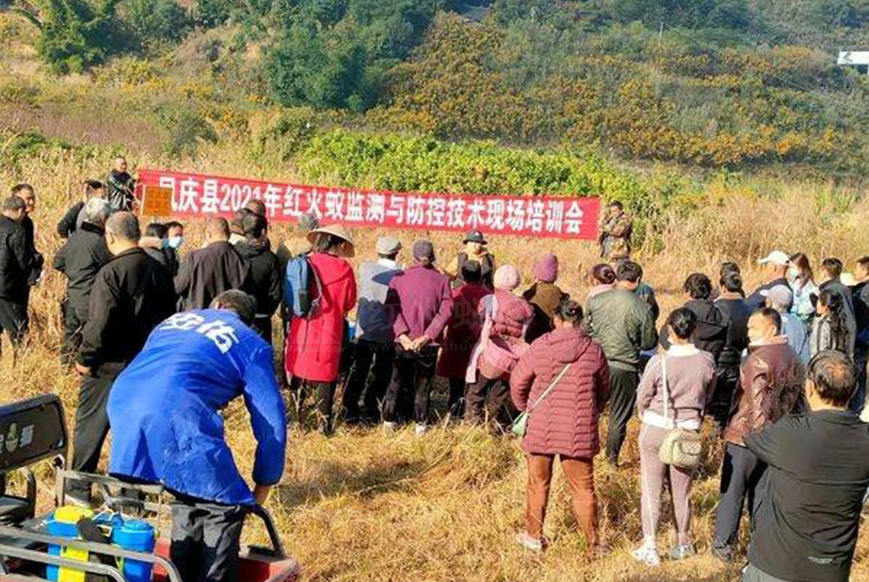据了解,红火蚁是一种极具破坏力的外来入侵生物,不仅给农业生产造成严重影响,还会给公共设施带来严重危害,人被红火蚁叮蜇后,会出现如灼伤般的水泡、脓包,敏感体质人群会出现全身过敏,甚至休克、死亡。培训会上,县农业农村局种子管理和植保植检站高级农艺师李玲艳对红火蚁入侵以来的防控情况进行介绍,对红火蚁的生物学特征、生活史、攻击性和危害性、传播途径、防治方法等方面进行了详实的讲解,现场展示了红火蚁防治的两种方式和用药注意事项,培训中,技术人员给参训农户发放科学用药宣传材料100余份、红火蚁识别与防控宣传材料100余份和部分防治用药。