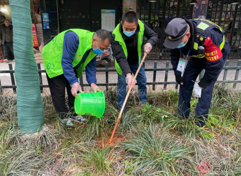 考虑到其危害性,网格员立即回到街道办后根据药品使用说明书科学勾兑药水比例。在“七员入网”工作机制下,街道网格员、城管执法人员联合处置,到该巢穴处开展灭杀工作,先用工具撬开红火蚁巢穴向巢穴内浇灌药水,随后用木棍搅拌药水与泥土充分混合呈浆糊状后,完成消杀工作。