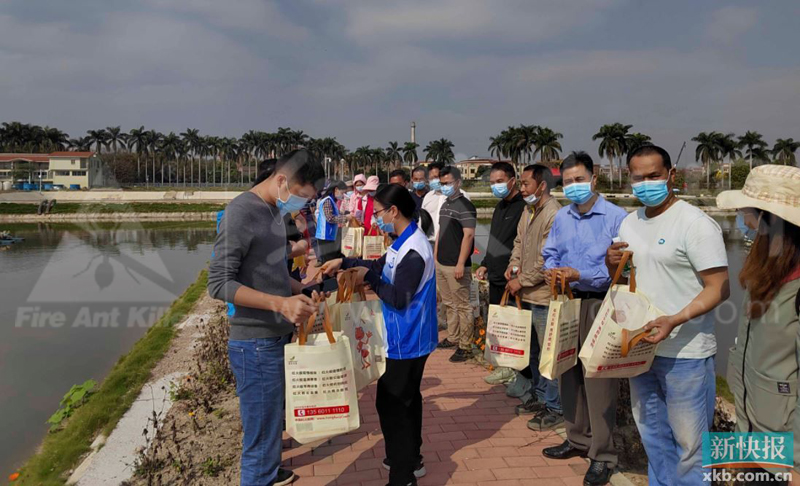 东涌镇农业农村技术服务中心邀请科普志愿者、广州瑞丰生物科技有限公司高级农艺师林小军走到田间地头,为各村生产主任、红火蚁防控专业队及水产养殖户进行红火蚁防控技术实操授课。南沙科普志愿者向市民派发红火蚁防控宣传资料及防控药剂。