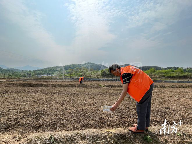 松柏村网格员走进田间地头在红火蚁发生区撒施药粉。