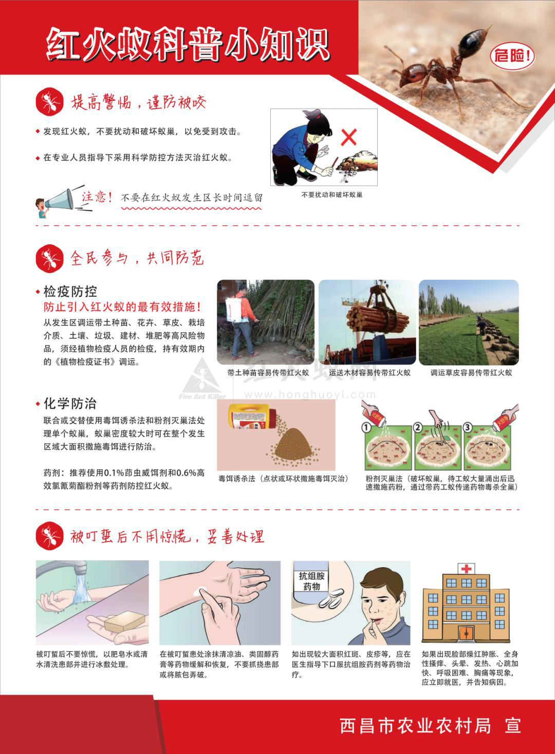 西昌市农村农业局也提醒市民,在发现红火蚁的地区进行户外活动,最好穿长袖衣裤、雨靴和手套,防止被咬伤。发现红火蚁后,不要触动、踩踏蚁巢,更不要用手去触摸、捉捕红火蚁;如居住区域屋外有草皮,要注意防范红火蚁入侵,在屋内长期使用灭蚁饵剂诱杀,每几个月更换一次;在庭院或其它户外区域可以使用含有有效成分的杀虫喷雾剂,沿墙脚或红火蚁行走的路线喷洒,在门框或窗框定期喷洒一条防护带,让其进不去室内。