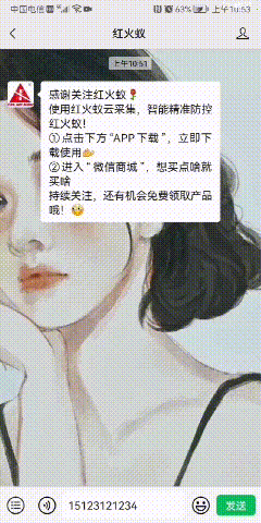 在“红火蚁”公众号菜单发送手机号码,自动获取密码,随后手机号码和密码可作为账号和密码登录红火蚁APP,即可使用云调查、云防控等更多云采集功能。