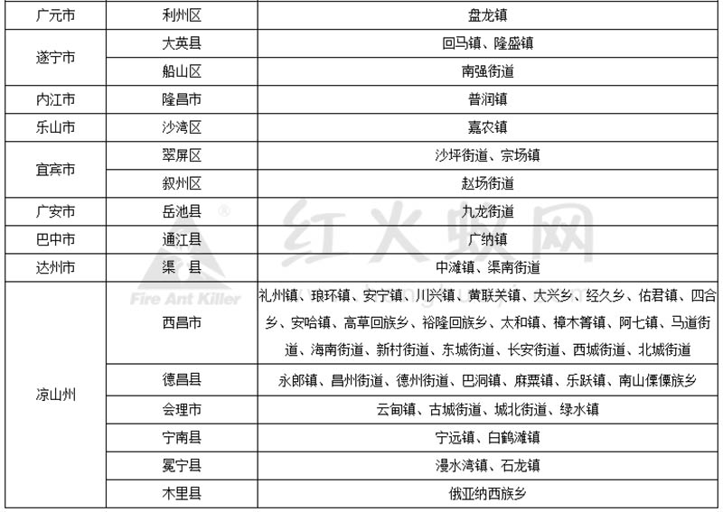 根据《植物检疫条例实施细则(农业部分)》《植物检疫条例实施细则(林业部分)》相关规定,按照农业农村部、住房和城乡建设部等九部门《关于加强红火蚁阻截防控工作的通知》(农农发〔2021〕3号)要求,为指导各地及相关部门加强红火蚁疫情监测调查、阻截防控和检疫监管,指导从事生产经营活动的相关单位、企业、个人依法生产、调运应施检疫的植物及植物产品,农业农村厅、省林草局联合制定了《四川省红火蚁发生县、乡级行政区名录》,现印发各地,请认真做好相关工作。2021年5月12日印发的《四川省红火蚁发生县、乡级行政区名录》同时废止。