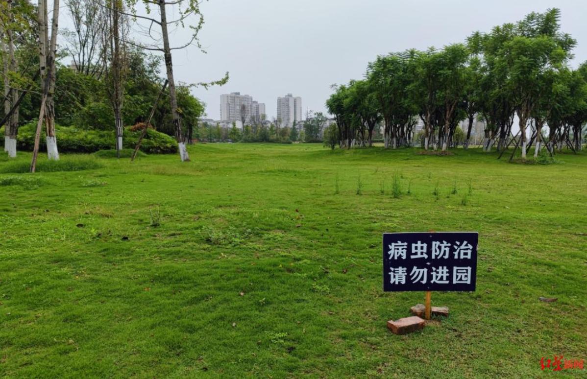 近日,有市民反映,在金堂县淮州新城的怀安军遗址公园草坪上,出现了红火蚁,公园设立了“病虫防治 请勿入园”的警示牌。