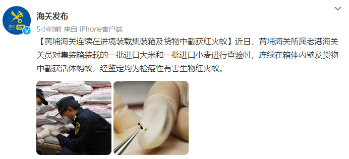 近日,黄埔海关所属老港海关关员对集装箱装载的一批进口大米和一批进口小麦进行查验时,连续在箱体内壁及货物中截获活体蚂蚁,经鉴定均为检疫性有害生物红火蚁。