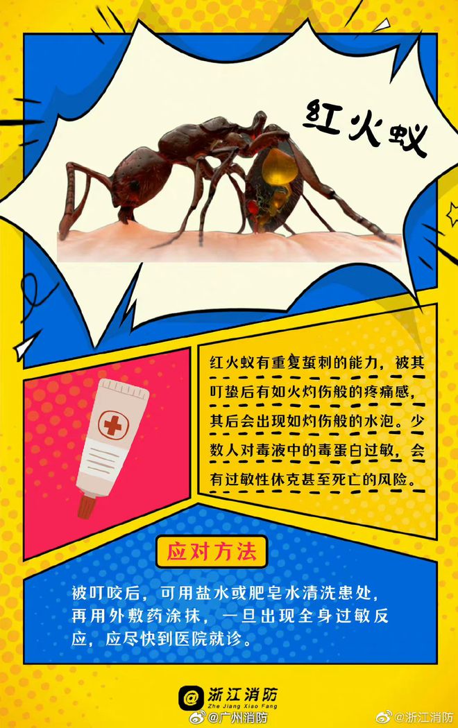 雷艳介绍,红火蚁的攻击性强烈,遇到刺激会主动发起攻击。其尾部带有螯针和毒囊,可以重复蜇刺,每次蜇刺都会向人体释放毒液。被叮咬后,人的皮肤会发红、有烧灼般疼痛感和瘙痒感,其后出现类似灼伤的水泡。半天到一天,蜇刺处化脓形成脓包。如果水泡破裂,还可引起细菌性感染。