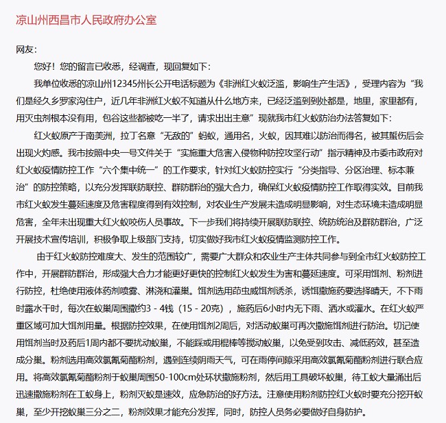 西昌市农业农村局回复网民,可采用饵剂、粉剂进行防控,杜绝使用液体药剂喷雾、淋浇和灌巢。饵剂选用茚虫威饵剂诱杀,诱饵撒施药要选择晴天,不下雨时露水干时,每次在蚁巢周围撒约3-4钱(15-20克),施药后6小时内无下雨、洒水或灌水。在红火蚁严重区域可加大饵剂用量。