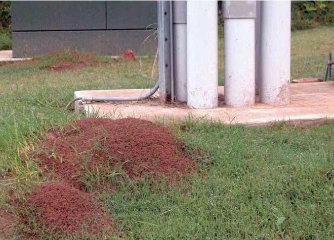 红火蚁的大量滋生,会对公共设施设备产生一定的危害,可咬断林区电线、电缆的绝缘层,将泥土带入设备中,导致电器短路损害,造成极大的经济损失。