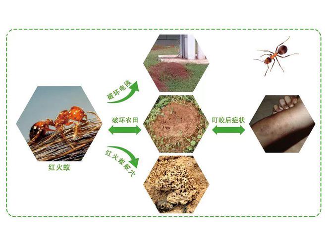 红火蚁具有食性杂、繁殖力强等特点,可取食多种农林作物和其他节肢动物、无脊椎动物、脊椎动物、植物和腐肉等。红火蚁是一种攻击性非常强的蚂蚁,当它们感受到威胁时,会立即发动攻击,并释放出强烈的刺激性气味呼朋引伴,吸引其他红火蚁前来攻击。当人误踏入蚁巢时,会被它们群起而攻之。人被红火蚁蜇伤后,5—20分钟内就会发病,轻者患处长脓疤、红肿、癌痒、疼痛,略重者局部过敏,严重的过敏反应延展到主体躯干,甚至发生休克和死亡,这对人们的日常生活造成极大的影响。