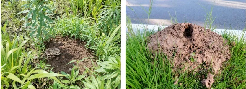 注意观察地形,红火蚁有一个较为明显的特征是会搭建蚁巢,看到草地上隆起的小堆松松的泥,像拱起来的沙包,千万别去踩踏它,很有可能就是红火蚁的巢穴。