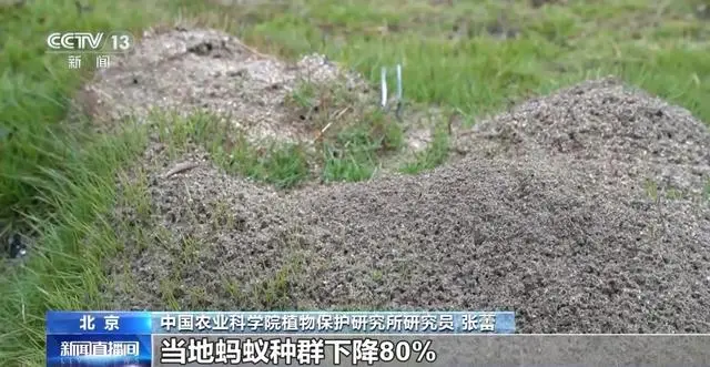 中国农业科学院植物保护研究所研究员 张蕾:它对我们生态环境的影响非常大,我国华南地区草坪、绿地等地因红火蚁入侵导致本地蚂蚁种群下降80%以上;在美国,红火入侵严重地区当地蚂蚁种群也会下降70%多,节肢动物物种丰富度下降了60%。