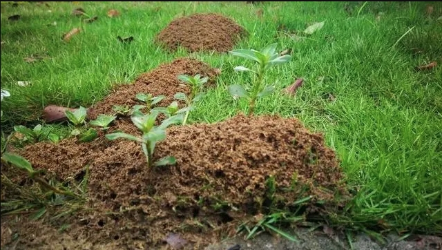 红火蚁的蚁巢比较容易辨认,一般有30厘米~40厘米高,下雨后很容易凸显出来。