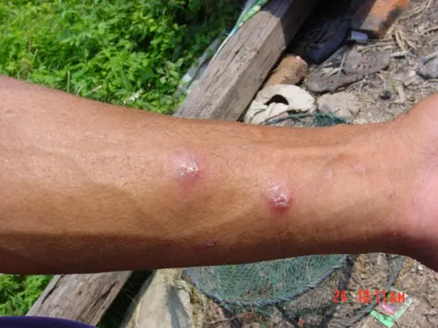 人被红火蚁叮咬后,手上留下的红肿脓包。受访者供图
