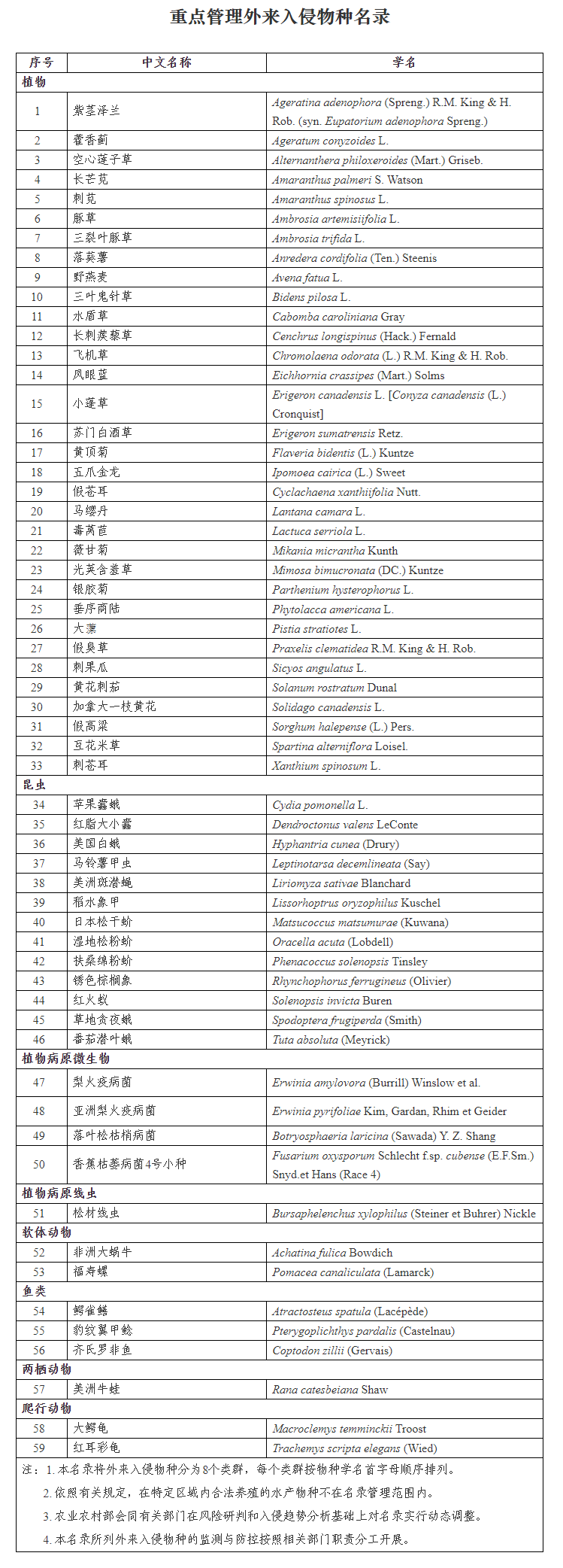 2022年12月20日,农业农村部会同自然资源部、生态环境部、住房和城乡建设部、海关总署和国家林草局组织制定了《重点管理外来入侵物种名录》,将加拿大一枝黄花、鳄雀鳝等59种外来入侵物种纳入重点管理名录,并于2023年1月1日正式施行。