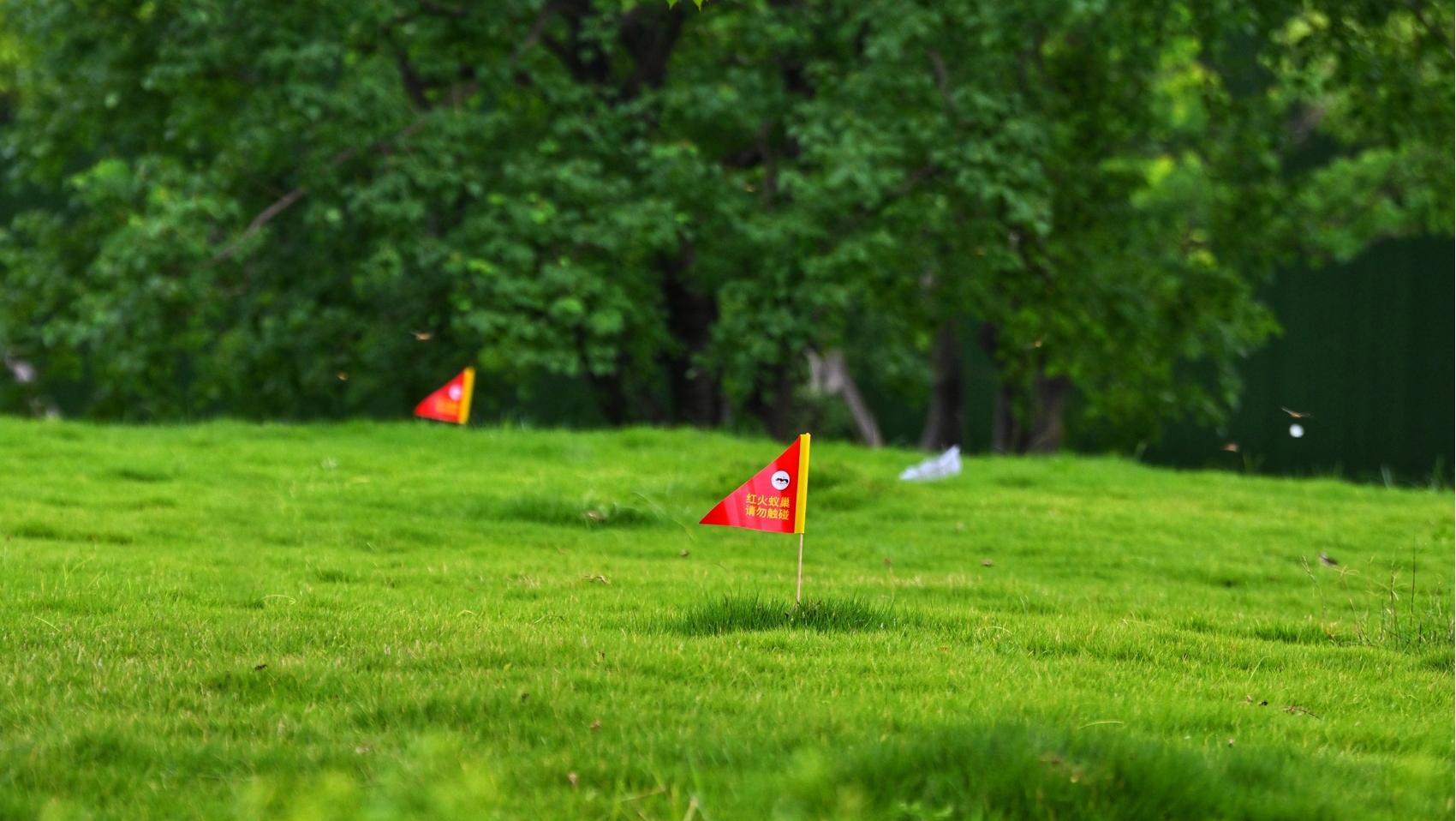 7月2日,成都高新区新程大道新裕南三路临街的草坪上,7、8面小红旗零散插于草坪中褐色隆起的小土堆上,红底黄字的“红火蚁巢 请勿触碰”特别醒目。在相邻还有3处草坪,都用警戒线划出了红火蚁防治区域。这是成都市林业和草原有害生物防治检疫站工作人员在寻到红火蚁踪迹后进行的及时处置。