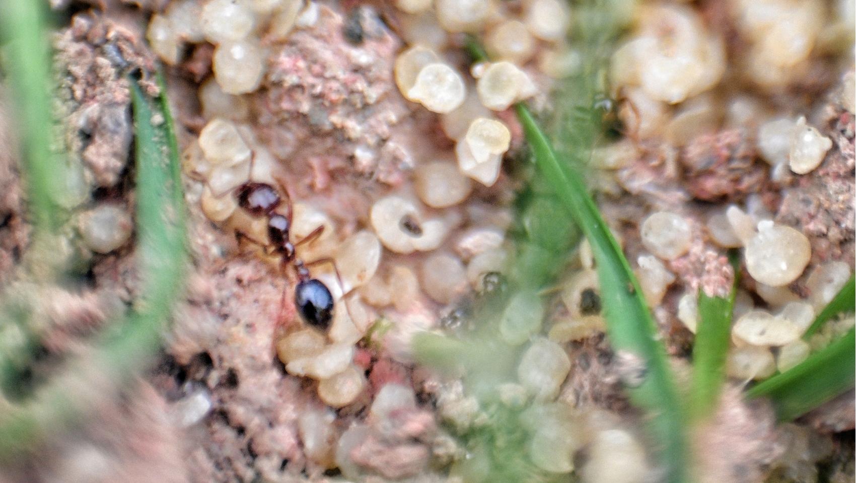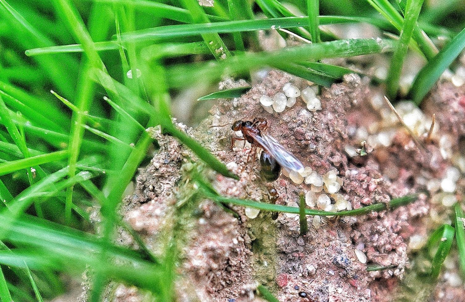 带翅膀的红火蚁是繁育后代的生殖蚁,旁边淡白色的就是红火蚁产的卵。