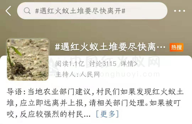 短时间内已有1.1亿网友围观据报道,近日,昆明官渡街道办事处开始对世纪城如意公园绿地内的红火蚁进行施药灭杀。从一月份开始,他们就一直对重点区域的红火蚁进行监测。目前,辖区内已经处置蚁巢共计5000个左右,防治面积大约为800亩。