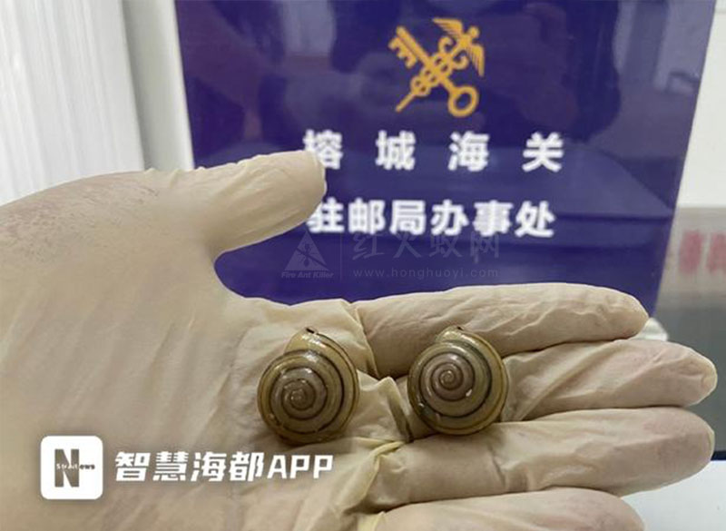 2020年11月份,福州海关所属榕城海关,在一件来自中国台湾地区、品名申报为“干净贝壳”的邮件中查获活体蜗牛2只,经鉴定为班卡拉蜗牛,系福州口岸首次截获。据了解,班卡拉蜗牛在中国大陆地区尚无分布,属外来入侵物种。