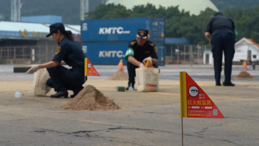 演练中,海关工作人员按照操作规程对疑似红火蚁的样本进行取样,开展实验室检疫鉴定,迅速启动应急处置程序,对受侵染的苗木进行隔离和除害处理;采用踏查法和诱集法对红火蚁疫情进行监测,评估疫情风险等级,启动进出境重大植物疫情应急处置响应,采用粉剂和饵剂应急处理等多种处置方法,成功消除红火蚁疫情。