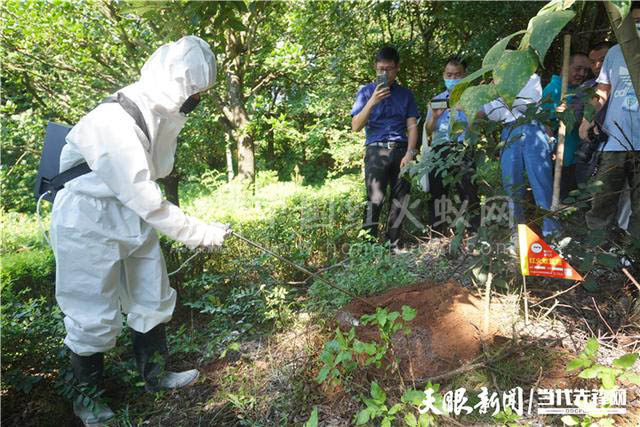 “红火蚁在气温高时觅食比较活跃,我们使用低毒、高效、安全的灭蚁耳剂与粉剂去进行大面积的撒播,把很多红火蚁杀死之后,再对重点残留下来的蚁巢,进行一个一个攻破,达到科学防控的作用。”省植保植检站技术人员现场对红火蚁进行消杀演示。