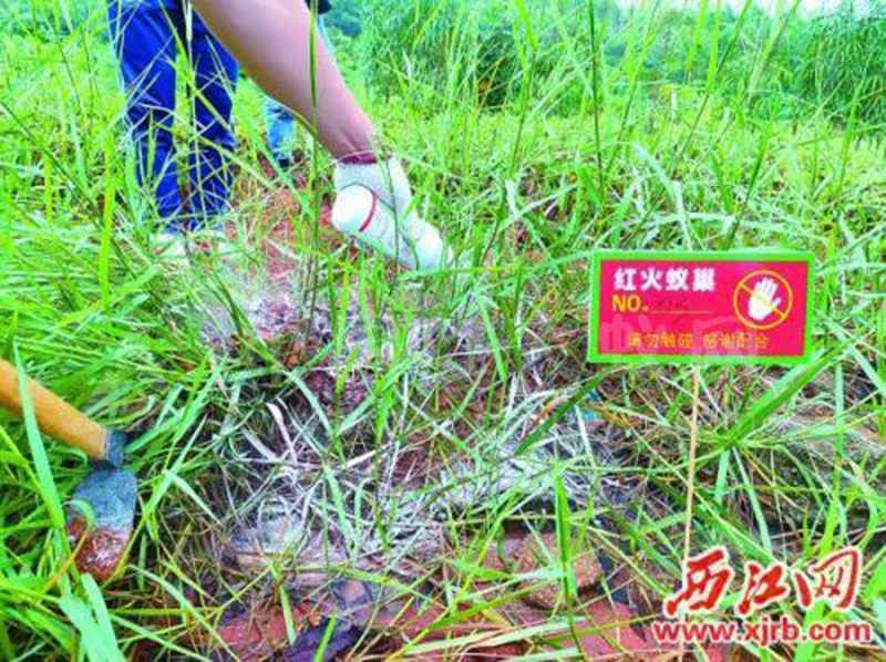 “防治红火蚁需要专业的公司处理,但前期的发现更为重要。因为红火蚁筑巢隐蔽,垂直深度可达1米,且每巢的蚁后多,不彻底灭杀蚁后很难清除。”德庆县农业农村局的一名工作人员指着一处红火蚁巢告诉记者,一旦灭杀不完全,蚁后还会采取分巢的方式扩散蔓延,后续的防控更加困难。