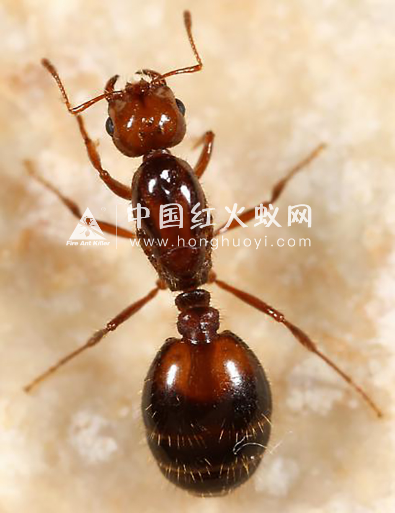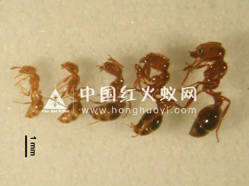 红火蚁工蚁体型大小呈连续性变型,一个蚁群中存在形态相似、大小不同的工蚁个体。