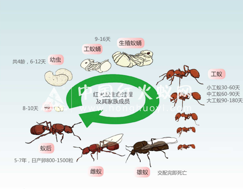 成熟的红火蚁蚁群中,红火蚁个体数量可多达几万到数十万头,由数量众多的多形态工蚁、几百头有翅繁殖雄蚁和雌蚁、一头(单蚁后型)或多头(多蚁后型)繁殖蚁后及较多的处于生长发育阶段的幼蚁(卵、幼蚁、蛹)组成。
