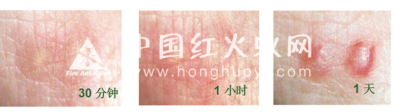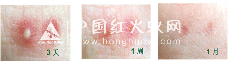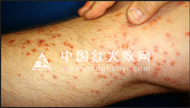 人体被红火蚁蜇刺后会有如火灼伤般的疼痛感,其后出现类似于灼伤的水泡,半天到一天后蜇刺处化脓形成脓包。如水泡或脓包破掉,若不注意清洁卫生则易引起二次感染。